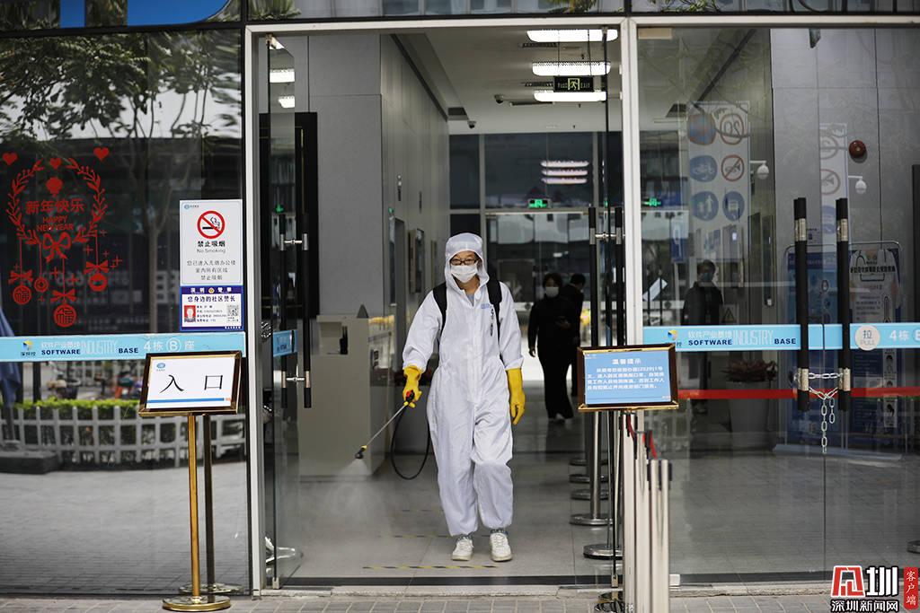 深圳軟件產(chǎn)業(yè)基地的一座辦公樓,一位正在進(jìn)行消毒作業(yè)的工作人員。