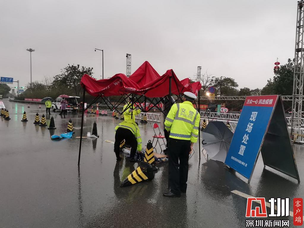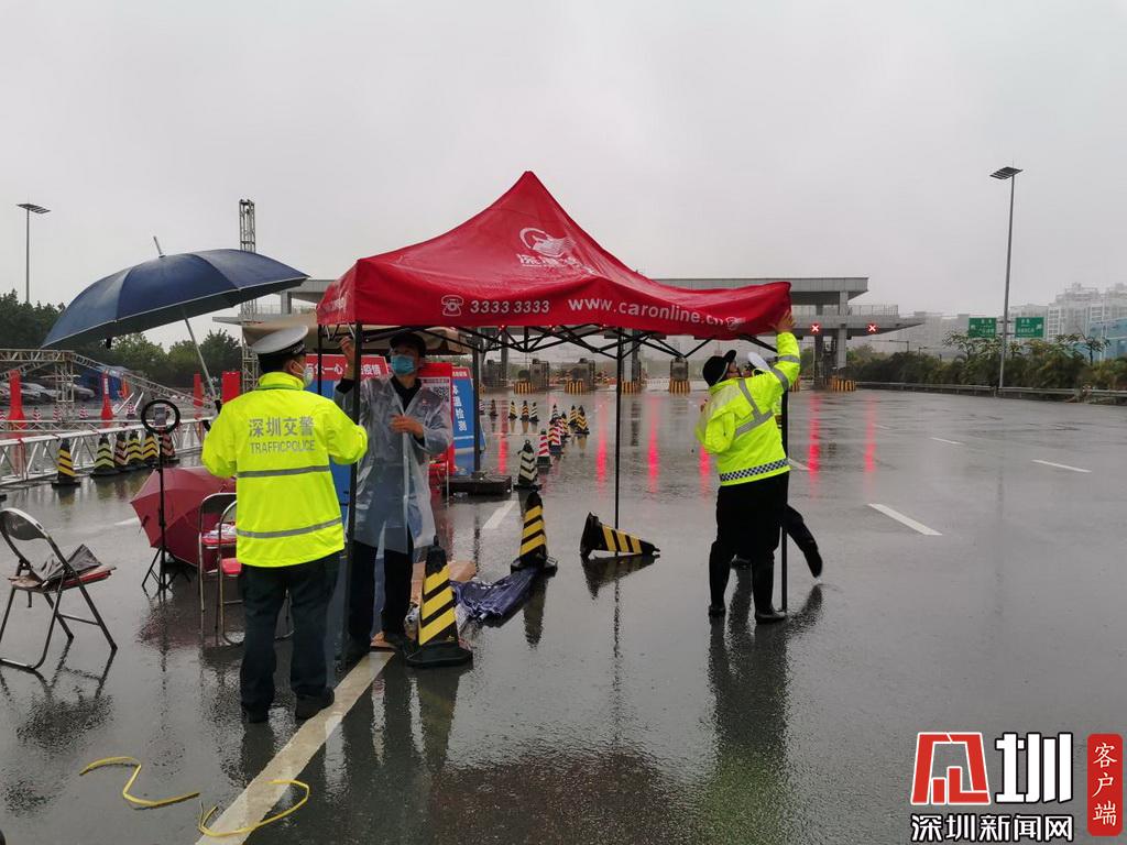 暴雨來臨,深圳交警民警在檢疫點(diǎn)安裝雨棚。