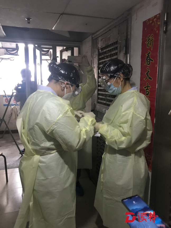 孫女士打開門,將工作人員遞進去的防護裝備穿戴完畢。“為了保護醫(yī)護人員的安全,減少交叉感染的可能性,所有的上門檢測都會在樓道里進行?!鄙缈抵行墓ぷ魅藛T說。提前穿好防隔服等防護裝備、拿檢測時給居民坐的凳子、為凳子消毒,開始進行檢測前就需要做很細致的準備工作。
