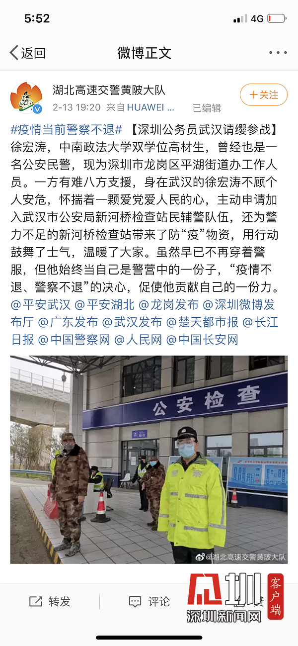 龍崗公務(wù)員滯留湖北“變”輔警 把守武漢東北大門