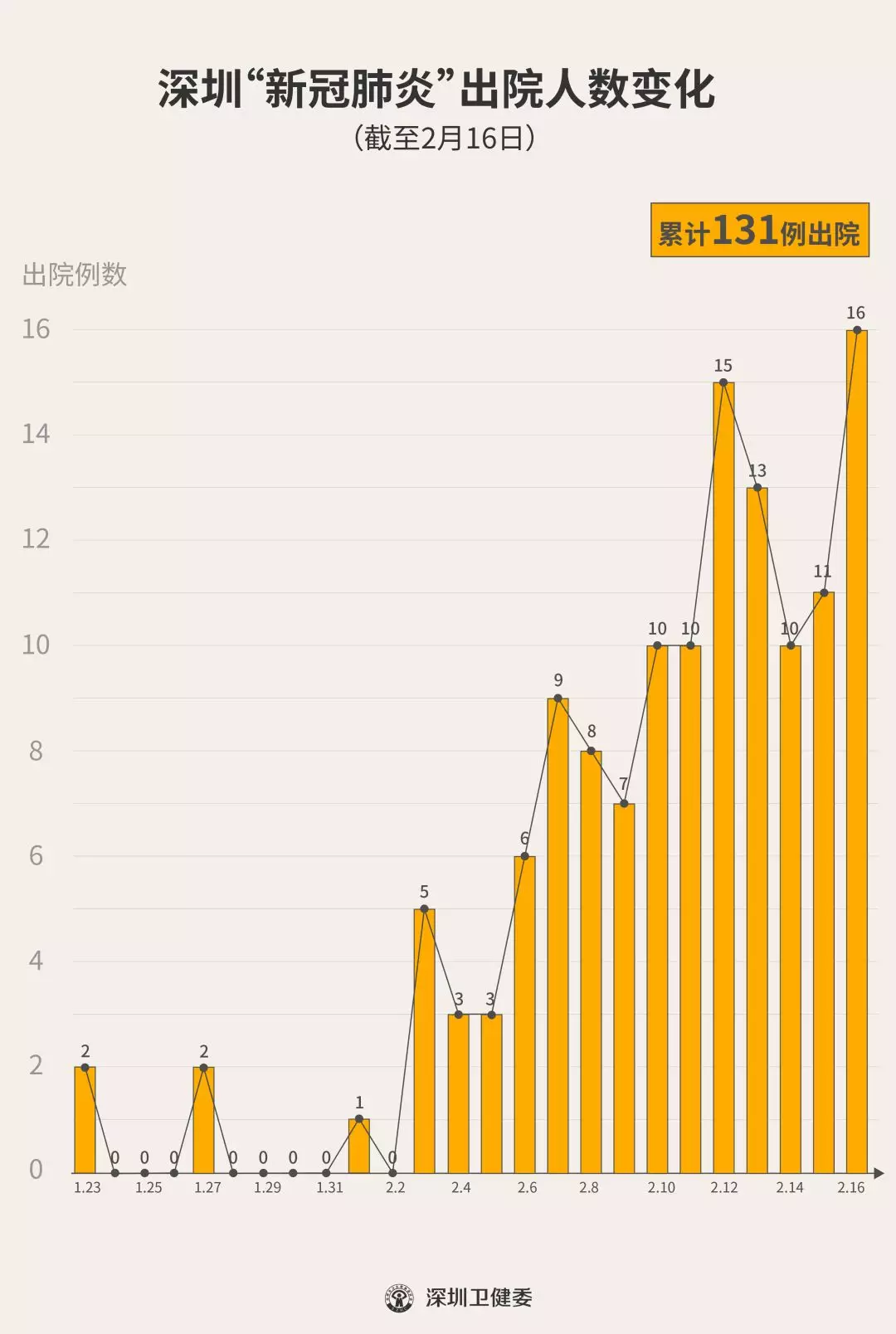 2月16日下午,經(jīng)專家組會診,深圳再有16名新型冠狀病毒肺炎確診患者出院,累計達131人,連續(xù)14天有人出院。