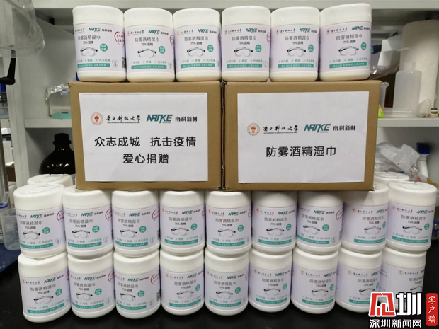 據(jù)悉,首批捐贈的護目鏡防霧酒精濕巾數(shù)量為6000張(100桶)。該濕巾由孫大陟和南科大首屆畢業(yè)生張至共同發(fā)起創(chuàng)立的深圳南科新材科技有限公司和孫大陟課題組共同緊急研發(fā)趕制,簡單擦拭后可保證護目鏡鏡片長時間不起霧,對人體人眼無毒無害,且能起到有效消殺病菌作用。每片濕巾可至少擦拭一副護目鏡,防霧效果可至少持續(xù)一天,大大節(jié)省了醫(yī)護人員清潔裝備的時間,為爭分奪秒抗擊疫情提供了有利條件。