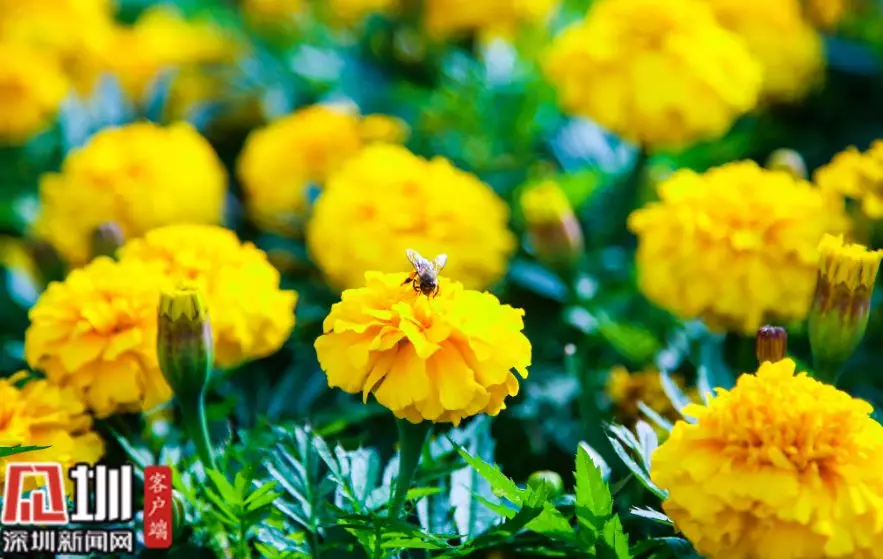 百花爭艷的蓮花山公園,惹來了忙著采蜜的蜜蜂。