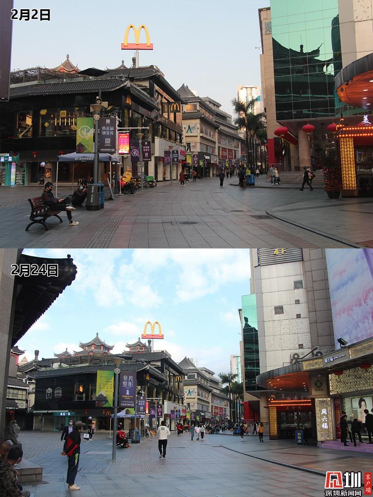 上圖為2月2日,在東門步行街人煙稀少,下圖為2月24日,東門步行街進(jìn)入復(fù)工第一天,營業(yè)的店面開始增多。