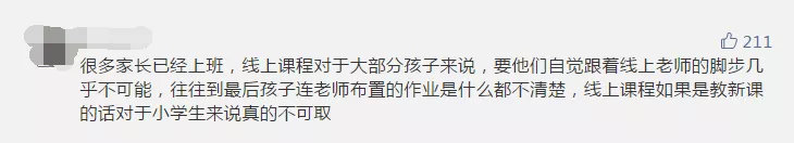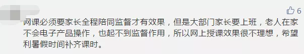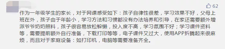 雖然網(wǎng)課兩端是老師和學(xué)生,但家長(zhǎng)的參與也必不可少。部分參與者認(rèn)為,如果沒(méi)有家長(zhǎng)的有效監(jiān)管,網(wǎng)課很難保證教學(xué)質(zhì)量,而大部分家長(zhǎng)已經(jīng)復(fù)工,無(wú)法時(shí)刻盯著孩子。有些家長(zhǎng)晚上下班后還要監(jiān)督孩子上網(wǎng)課、做作業(yè),實(shí)在“費(fèi)時(shí)、費(fèi)力、費(fèi)神”。讓孩子自己上網(wǎng)課,有些“連作業(yè)是什么都不清楚”。還有些孩子利用上網(wǎng)課的空檔玩游戲,甚至“從十七號(hào)開(kāi)始到現(xiàn)在玩游戲超過(guò)1萬(wàn)塊”。