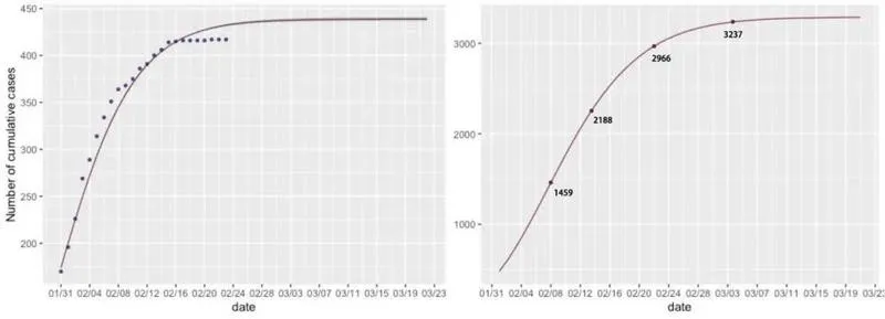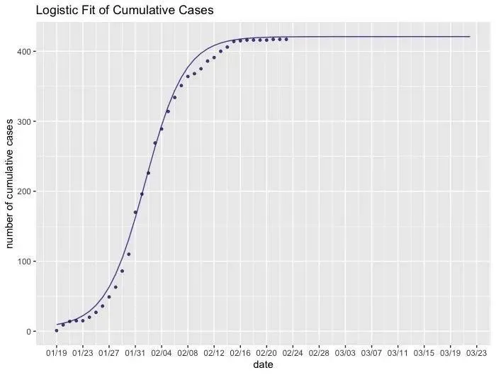 進一步地擬合深圳新冠肺炎的累計確診人數(shù),并對累計確診人數(shù)做出預測??梢钥吹剑P皖A測自2月28日起病例數(shù)不再增加,預測得到最終的累計確診人數(shù)收斂在422人左右。