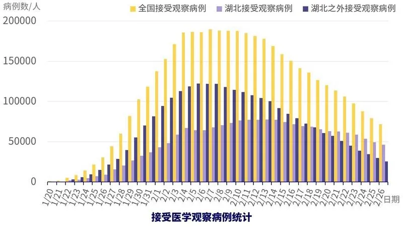 還值得關注的是正在接受醫(yī)學觀察的人數(shù),在全國嚴格管控的情況下,未來新增確診病例很大比例會來自這部分人群。從數(shù)據(jù)中可以看到,非湖北地區(qū)接受醫(yī)學觀察人數(shù)正在快速下降,湖北地區(qū)的也在穩(wěn)步下降中,這可能預示著未來新增確診病例也將下降。