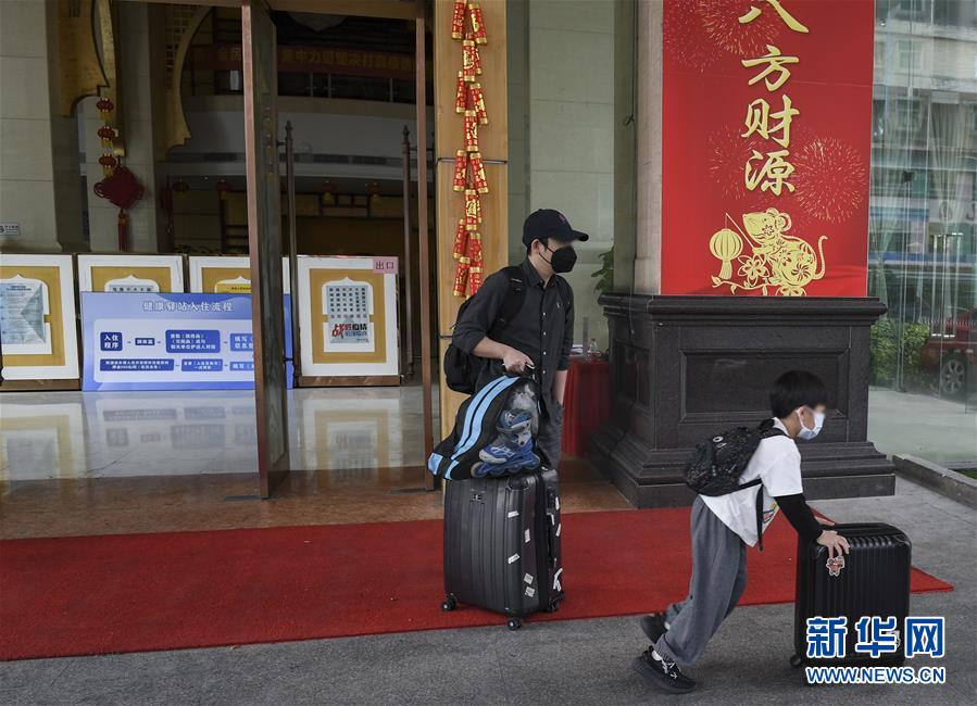 2月27日,結(jié)束留觀的一家人離開位于深圳龍崗的一家“健康驛站”。 新華社記者 毛思倩 攝