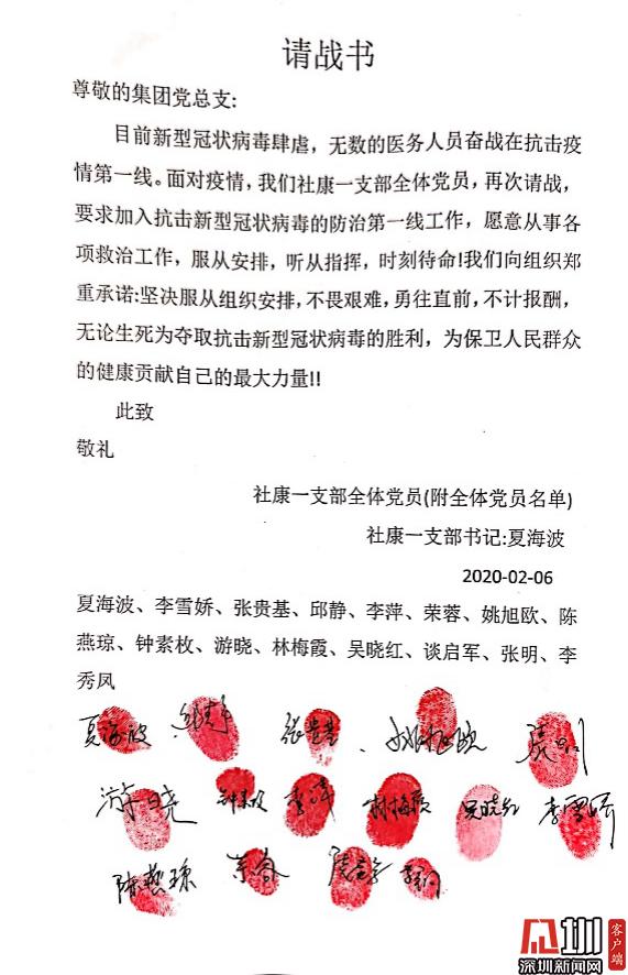 見圳客戶端·深圳新聞網(wǎng)訊(記者 董非)“讓黨旗在防控斗爭第一線高高飄揚(yáng)?!毙鹿诜窝滓咔榘l(fā)生以來,南山區(qū)醫(yī)療集團(tuán)總部黨員勇當(dāng)先鋒,以實(shí)際行動(dòng)踐行初心使命,涌現(xiàn)出眾多感人故事,展現(xiàn)了共產(chǎn)黨員的風(fēng)采與擔(dān)當(dāng)。 疫情發(fā)生后,南山區(qū)第一時(shí)間制定出臺(tái)了《黨建引領(lǐng)疫情防控工作五項(xiàng)行動(dòng)方案》,南山區(qū)委書記王強(qiáng)號(hào)召全體黨員,發(fā)揮黨組織的戰(zhàn)斗堡壘作用和黨員的先鋒模范作用,全力保障人民群眾生命安全和身體健康,讓黨旗在防控疫情斗爭第一線高高飄揚(yáng),堅(jiān)決打贏疫情防控人民戰(zhàn)爭、總體戰(zhàn)、阻擊戰(zhàn)。南山區(qū)醫(yī)療集團(tuán)總部積極響應(yīng),黨建引領(lǐng)下的防控抗疫工作有序科學(xué)地展開。 今年1月底,深圳市南山區(qū)區(qū)委授旗成立南山醫(yī)療系統(tǒng)黨員突擊隊(duì)。南山區(qū)醫(yī)療集團(tuán)總部緊急組建了防控新冠肺炎應(yīng)急突擊隊(duì),僅一天內(nèi)區(qū)醫(yī)療集團(tuán)就共有169人完成第一批應(yīng)急突擊隊(duì)報(bào)名,其中黨員過半數(shù)。 疾風(fēng)知?jiǎng)挪荩一馃捳娼?。一封封請?zhàn)書閃電匯聚到黨總支,召即來,來能戰(zhàn),戰(zhàn)能勝,沖鋒在前就是擔(dān)當(dāng)?shù)淖蠲姥堇[;一位位黨員迅速入隊(duì)黨員突擊隊(duì),他們重溫入黨誓言,在黨旗下實(shí)踐著醫(yī)者仁心、人間大愛;一份份入黨申請書紛沓而來,特殊時(shí)期經(jīng)受特殊考驗(yàn),一批優(yōu)秀的醫(yī)護(hù)人員頁主動(dòng)向黨組織靠攏。鏗鏘的語言、堅(jiān)定的決心、舍我的擔(dān)當(dāng),是南山區(qū)醫(yī)療集團(tuán)總部廣大黨員逆行而上、抗擊疫情的堅(jiān)定決心和必勝信心。 最美逆行黨支部,積極請戰(zhàn)敢擔(dān)當(dāng) “我是共產(chǎn)黨員,我請戰(zhàn)!愿為戰(zhàn)勝疫情全力以赴!”這是南山區(qū)醫(yī)療集團(tuán)總部一支部13名黨員和2名入黨積極分子聯(lián)名撰寫的《請戰(zhàn)書》(節(jié)選)。 面對新冠肺炎疫情,一支部黨員在夏海波支部書記夏海波的帶領(lǐng)下,在發(fā)熱門診、發(fā)熱患者預(yù)檢分診、社區(qū)“三位一體”排查等工作中,積極發(fā)揮共產(chǎn)黨員戰(zhàn)斗在一線、沖鋒在一線的模范帶頭作用,為戰(zhàn)勝新冠肺炎疫情全體黨員積極主動(dòng)請戰(zhàn),并向集團(tuán)黨總支遞交了請戰(zhàn)書。 社康一支部全體黨員的請戰(zhàn)書 一個(gè)個(gè)紅手印,令人淚目,彰顯著南山區(qū)醫(yī)療集團(tuán)總部白衣天使們逆行而上的使命擔(dān)當(dāng)和責(zé)任意識(shí)。 一支部書記夏海波說,“成為疫情防控工作第一線發(fā)展黨員,是面對疫情充分發(fā)揮黨員先鋒作用的具體實(shí)踐。此次請戰(zhàn),將更加激勵(lì)他們我們在今后的工作特別是近期防疫防控工作中,以黨員的標(biāo)準(zhǔn)嚴(yán)格要求自己,發(fā)揮黨員先鋒模范作用。同時(shí),也會(huì)對全院全體員工產(chǎn)生積極引領(lǐng)、鼓舞作用,以更飽滿的斗志投入防疫防控工作?!?/p> 老黨員重溫入黨誓詞,面對黨旗表決心 “我宣誓:我志愿加入中國共產(chǎn)黨……”這是一次特別的宣誓。接到組織號(hào)召后,社康二支部的老黨員鐘達(dá)宏和吳麗娉,對著黨旗,以重溫入黨誓詞的方式,不忘黨員初心,牢記使命,積極沖鋒在前,誓要打贏防控狙擊戰(zhàn)。 社康二支部的老黨員鐘達(dá)宏和吳麗娉,對著黨旗,重溫入黨誓詞,誓要打贏防控狙擊戰(zhàn) 面對來勢洶洶的疫情,南山區(qū)醫(yī)療集團(tuán)總部的黨組織和黨員干部不但沒有被嚇倒,反而激起了他們昂揚(yáng)的戰(zhàn)斗意志和飽滿的工作熱情。 “我宣誓,我自愿加入抗擊新型冠狀病毒肺炎疫情防控工作隊(duì)伍,責(zé)任上肩,聽黨指揮,服從命令,科學(xué)應(yīng)對,恪盡職守,努力守護(hù)轄區(qū)居民健康,堅(jiān)決打贏疫情防控攻堅(jiān)戰(zhàn)!”守土有責(zé)、守土擔(dān)責(zé)、守土盡責(zé),所有社康中心的黨員干部將筑牢抗疫的基層防線,誓要守護(hù)轄區(qū)居民的生命健康。 社康二支部黨員在黨旗下宣誓努力守護(hù)轄區(qū)居民健康 艱難時(shí)刻主動(dòng)請戰(zhàn),夫妻雙雙奮戰(zhàn)一線 1月26日,南山區(qū)醫(yī)療集團(tuán)總部下發(fā)關(guān)于組建防控新型冠狀病毒感染肺炎應(yīng)急突擊隊(duì)報(bào)名的通知。除了得到集團(tuán)黨員們的積極響應(yīng)之外,各個(gè)支部涌現(xiàn)出一波遞交入黨申請書的小高潮。 李婧是社康支部的一名全科醫(yī)生,一直在社康醫(yī)院中心從事全科醫(yī)療工作,戰(zhàn)“疫”的號(hào)角吹響,李婧第一時(shí)間參戰(zhàn),在所有抗疫時(shí)期入黨人員里第一個(gè)遞交了手寫入黨申請書。 李婧醫(yī)生的手寫入黨申請書 起初,她所在的蔚藍(lán)海岸社康中心考慮到李婧的愛人是深圳市公立醫(yī)院急診科醫(yī)生其愛人是深圳市某公立醫(yī)院的急診科醫(yī)生,疫情發(fā)生以來一直堅(jiān)守在崗位上,家中尚有1歲零3個(gè)月的寶寶,就沒有讓她參加社區(qū)“三位一體”排查和酒店留守值班等一線工作和醫(yī)學(xué)觀察點(diǎn)留守值班等一線工作。李婧得知后,她主動(dòng)提交請戰(zhàn)書、舍小家顧大家,并