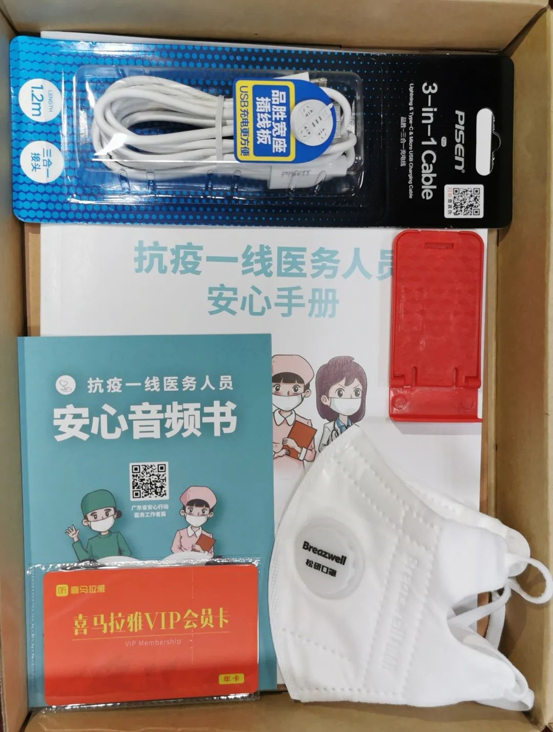 這是一個20x28cm2的普通牛皮紙紙盒,里面最顯眼的,是一本《安心手冊》,一張“抗疫一線醫(yī)務(wù)人員安心音頻書”卡,一張音頻APP的有聲書卡,和兩個N95口罩。此外,筆記本、筆、手機充電線、手機支架,也都細心地配全了。紙盒旁還放著一個小巧玲瓏的智能聲控音箱,使用者“不沾手”就能使用,防止病毒傳播。小東西里,也藏著大關(guān)愛。