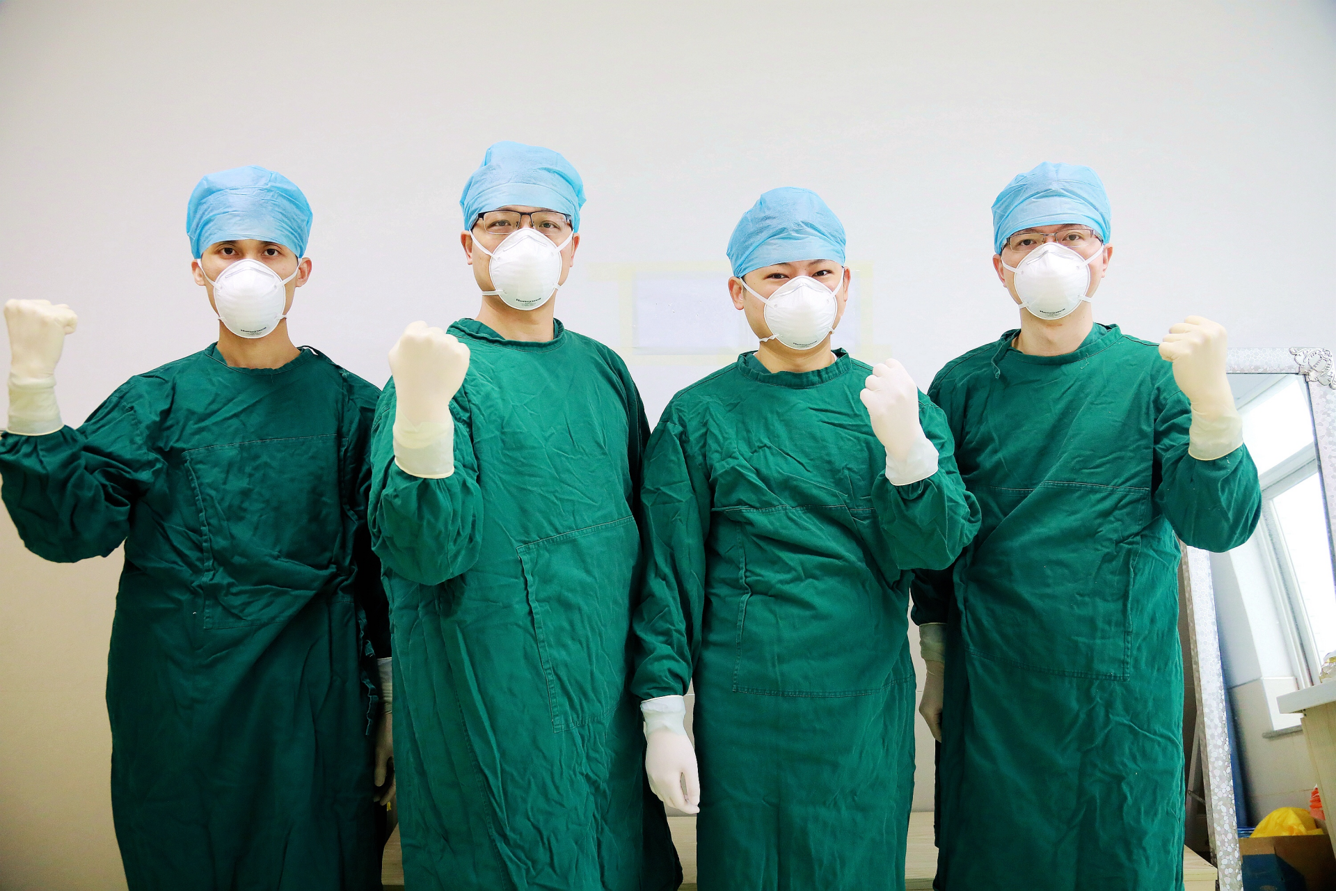 “四小金剛”與珠海中醫(yī)院重癥監(jiān)護(hù)科的戰(zhàn)友蘇文平(中)在進(jìn)入戰(zhàn)位前合影。