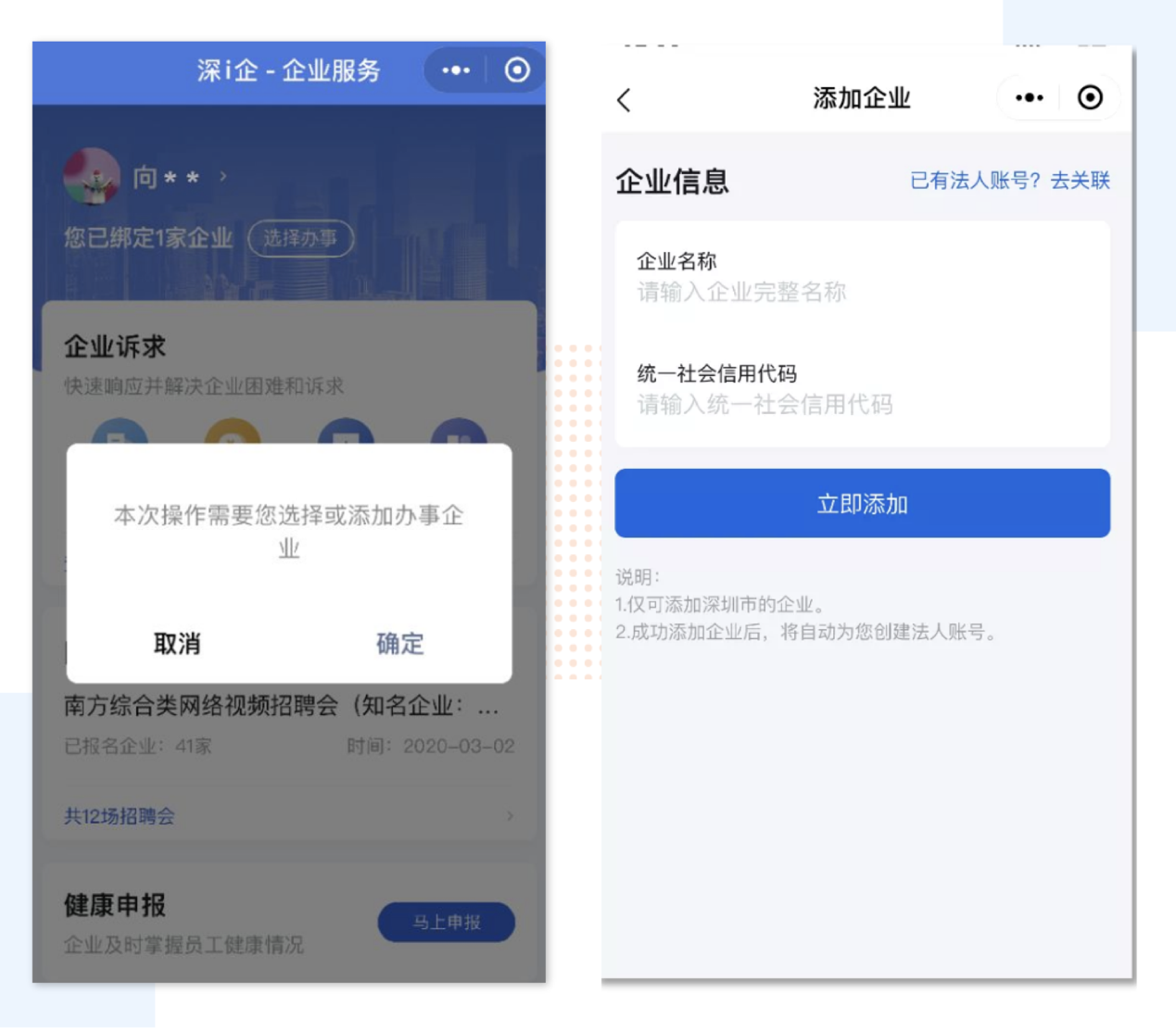 登錄后,進入“深i企-精準服務(wù)企業(yè)”平臺主頁面,點擊“選擇辦事”。法人或經(jīng)辦人通過輸入企業(yè)名稱和統(tǒng)一社會信用代碼添加辦事企業(yè),也可以通過已有法人賬號關(guān)聯(lián)企業(yè)。
