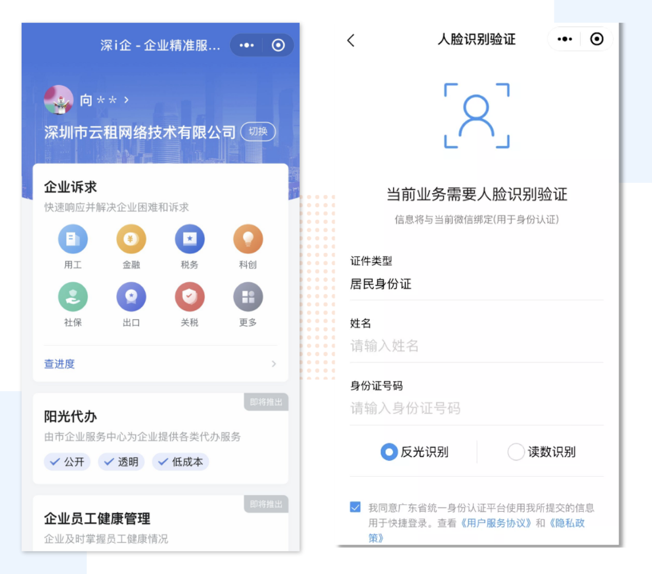 企業(yè)法人或經(jīng)辦人進入“深i企-精準服務(wù)服務(wù)”平臺,選擇登錄,進入實名認證環(huán)節(jié)。輸入姓名和證件號碼后,通過人臉識別即可完成實名認證。