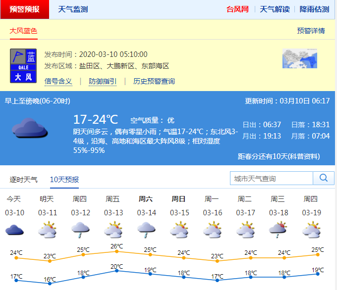 盡管冬天已經過去,但是當下的深圳乍暖還寒,氣溫變化較大,需要依據氣溫變化增減衣物,以防感冒。受新一股冷空氣影響,10日早晨有陣雨,伴零散雷暴,北風加大,沿海、海區(qū)和高地有7級左右陣風。10日白天降雨結束,可見陽光,氣溫略降3-4℃,氣溫18-23℃。11日氣溫下降至16℃左右,天氣轉涼。12-13日氣溫明顯回升。 (記者董思)