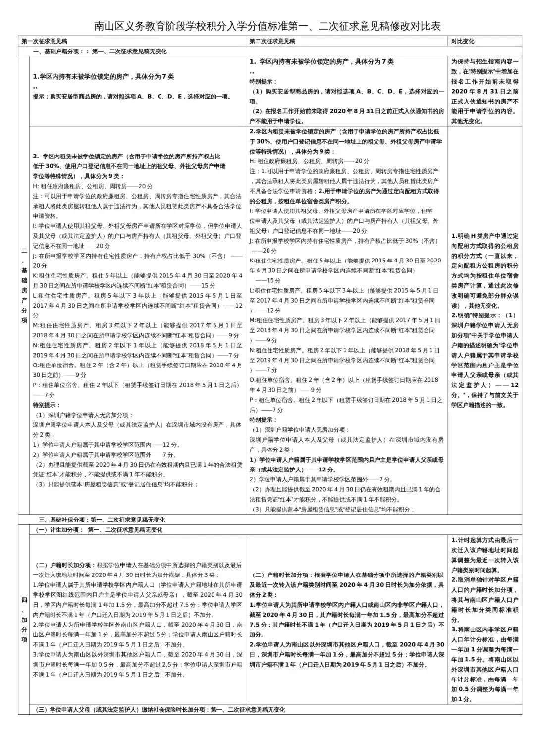 1月19日,南山區(qū)教育局第一次征求意見發(fā)出后,共收集到關(guān)于積分算法調(diào)整的反饋意見182條,并于2月10日第二次發(fā)布《南山區(qū)義務(wù)教育階段公布學(xué)校積分入學(xué)實(shí)施辦法》征求意見稿(以下簡(jiǎn)稱《意見》),根據(jù)《意見》內(nèi)容,擬調(diào)整2020年積分入學(xué)辦法。