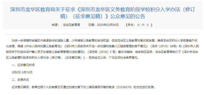 3月6日,深圳市龍華區(qū)教育局發(fā)布關(guān)于征求《深圳市龍華區(qū)義務(wù)教育階段學校積分入學辦法(修訂稿)(征求意見稿)》公眾意見的公告。