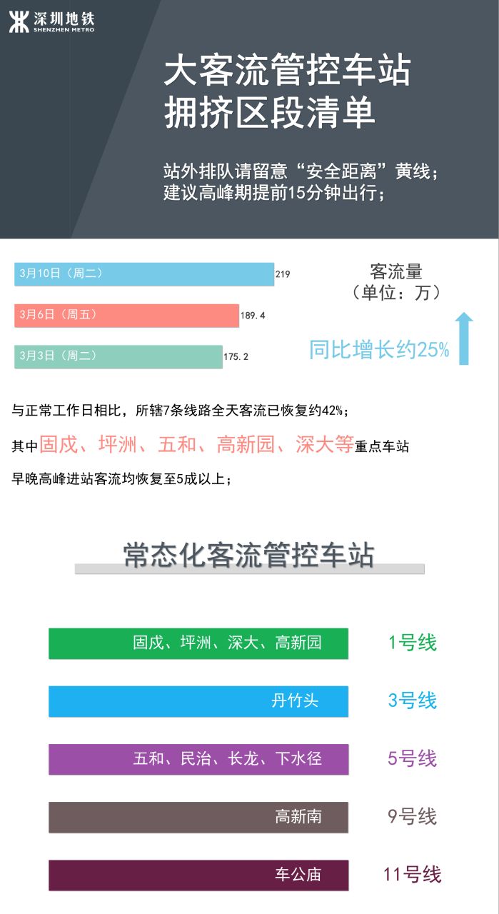 3月10日(周二),深圳地鐵所轄7條線路客流量已達219萬人次,為防止客流激增而造成乘客過度擁擠,深圳地鐵已在11座大客流站點,實行常態(tài)化客流管控。另外有17座重點車站,也將視客流情況隨時采取客流管控措施。