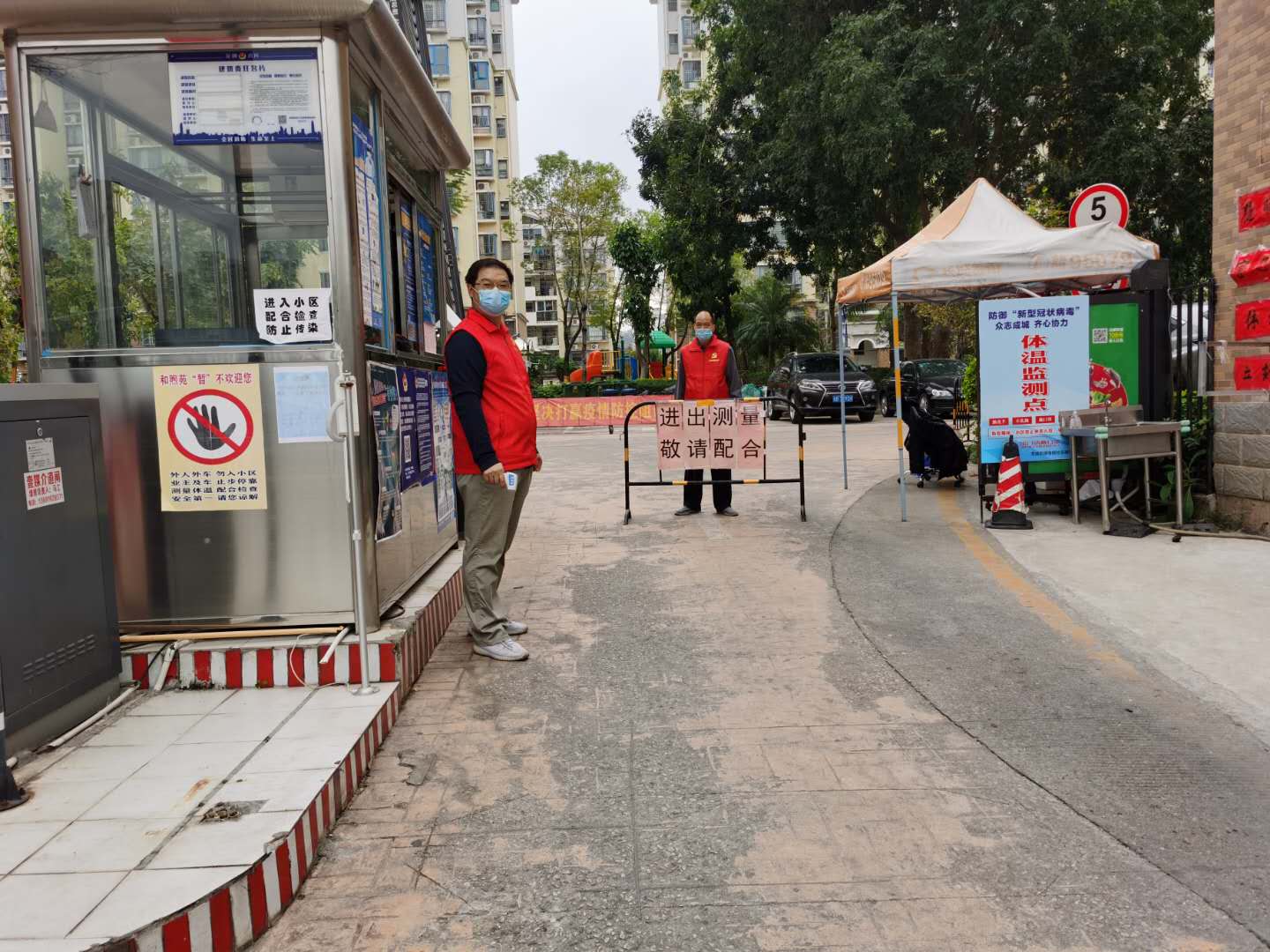 “梁經(jīng)理,我也是一名黨員,我申請(qǐng)加入咱們小區(qū)的疫情防控隊(duì)伍?!痹诓趟龠_(dá)的帶動(dòng)下,兒子蔡榮釗也積極投身防控“疫”線中。每日下班后,他都從寶安的工作單位趕回小區(qū),來(lái)到門(mén)崗卡點(diǎn),為進(jìn)出小區(qū)人員進(jìn)行登記、測(cè)量體溫,攔截外來(lái)人員和車輛。蔡榮釗這一堅(jiān)持,就是一個(gè)多月,得到了物業(yè)管理處和業(yè)主(住戶)們的高度好評(píng)。