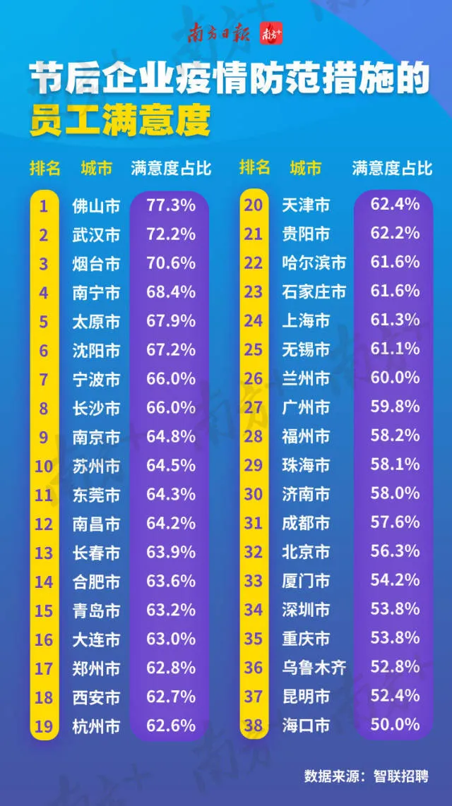 從上述《報(bào)告》中可以看出,佛山市企業(yè)的員工滿意度是全國最高的,高達(dá)77.3%,與全城“停擺”的武漢、山東煙臺齊齊超過七成滿意度。