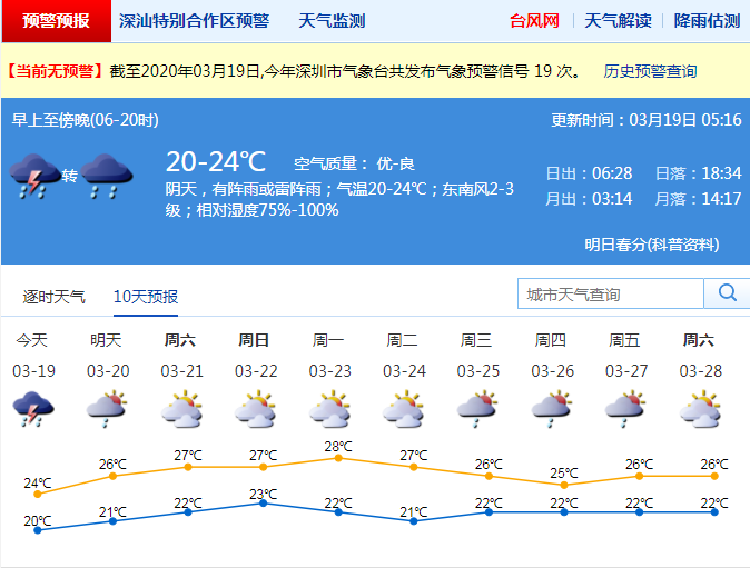 當(dāng)前,深圳已進(jìn)入強(qiáng)對(duì)流天氣多發(fā)季節(jié)。未來(lái)幾日天氣是否平穩(wěn)?據(jù)市氣象臺(tái)預(yù)測(cè),19日深圳有雷陣雨,局部大雨,氣溫20℃至24℃;20日陣雨轉(zhuǎn)多云;21日至24日濕度加大,氣溫逐日回升,天氣轉(zhuǎn)熱,早晚有輕霧或霧。