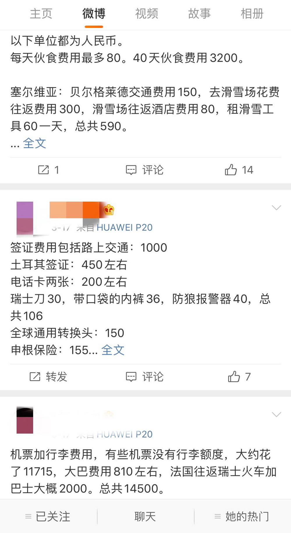 當(dāng)事人在微博上公布的旅行費(fèi)用