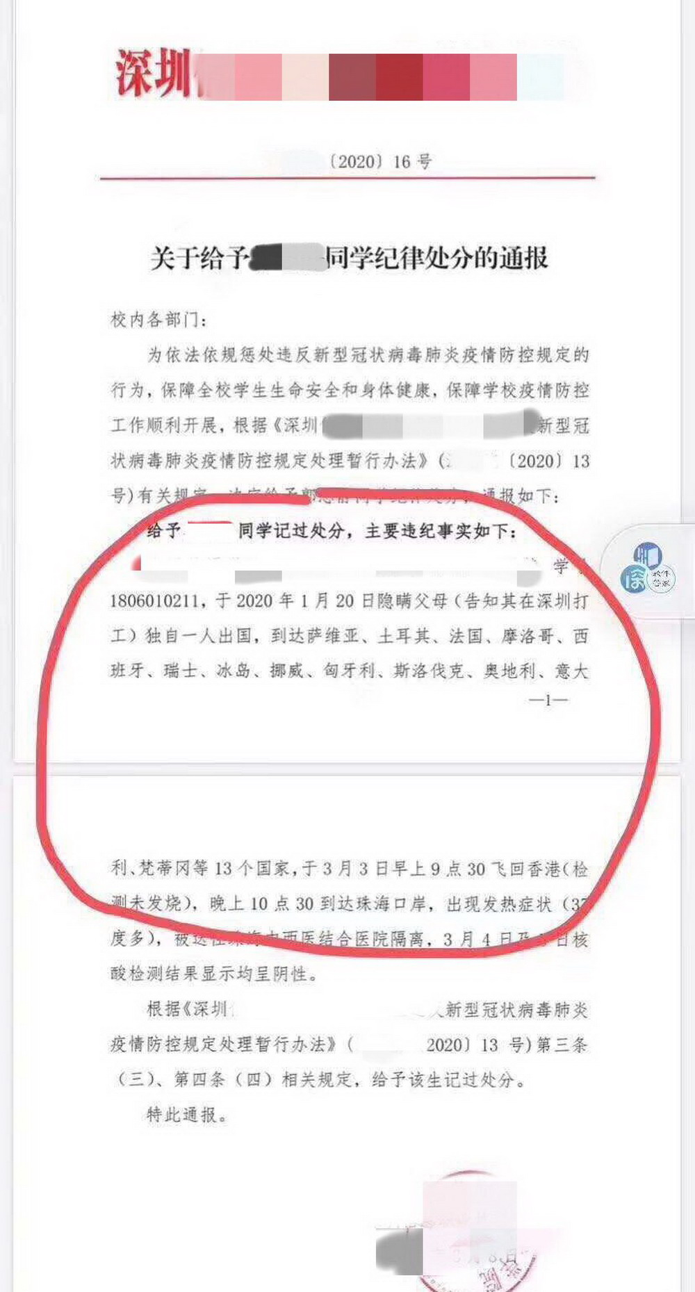 見圳客戶端·深圳新聞網(wǎng)2020年3月20日訊 近日,一位深圳女大學(xué)生小Y瞞著父母出游13國,回國后因發(fā)熱被隔離并因未如實(shí)向?qū)W校匯報(bào)行程被處分,此事引發(fā)社會(huì)關(guān)注。3月18日,當(dāng)事人接受深圳新聞網(wǎng)記者采訪,詳述事件經(jīng)過并表達(dá)悔意。