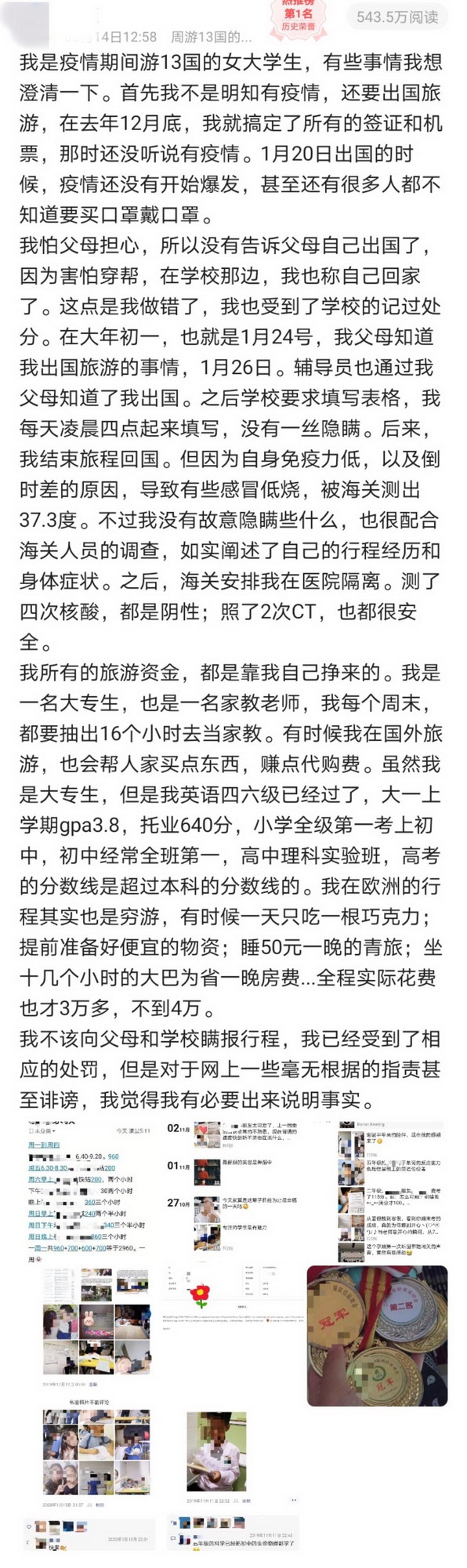 小Y后來知道,她的經(jīng)歷在網(wǎng)上引起關(guān)注并引發(fā)網(wǎng)友質(zhì)疑。記者從網(wǎng)上了解到,網(wǎng)友目前主要質(zhì)疑其旅行費(fèi)用來源,對此,小Y表示:“因?yàn)橹霸诰W(wǎng)上看到別的女生花一萬五窮游了11個(gè)國家,所以我也很想試一下,就開始很仔細(xì)的規(guī)劃,花了很多心思,我所有的旅行費(fèi)用都是我自己平時(shí)做家教賺的,出去玩也基本上是窮游?!贝送猓還將旅行所有費(fèi)用明細(xì)列出并在本人微博上公布。