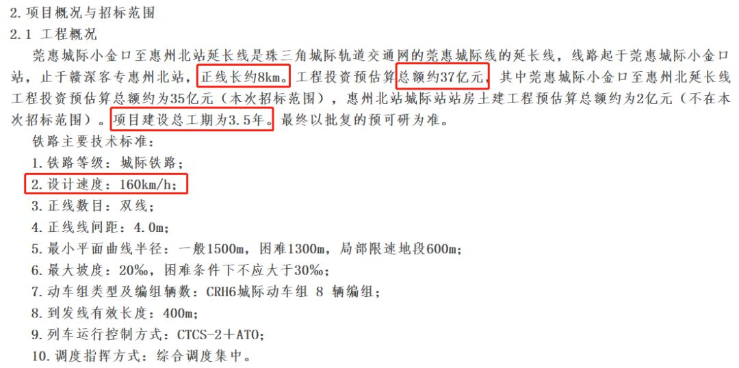 此間公示的莞惠城際小金口至惠州北站延長線,則是珠三角城際軌道交通網(wǎng)的莞惠城際線的延長線,線路起于莞惠城際小金口站,止于贛深客專惠州北站,正線長約8km,設計速度為160km/h。工程投資預估算總額約37億元,其中莞惠城際小金口至惠州北延長線工程投資預估算總額約為35億元(本次招標范圍),惠州北站城際站站房土建工程預估算總額約為2億元(不在本次招標范圍)。