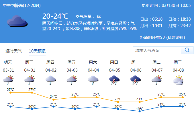 市氣象臺(tái)預(yù)測,31日至4月1日有陣雨或雷陣雨;2-3日多云到陰天,部分時(shí)間有分散小雨;展望清明假期期間,有明顯降雨過程。注意雨霧天氣低能見度對(duì)交通安全的影響。