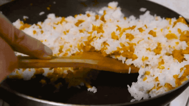 油鍋燒熱,不斷翻炒海膽,直到把海膽的水分炒干,只有動作快和把握好火候,才能保留海膽的鮮度。海膽炒得呈粒狀就可加入蒜蓉,這樣可以更好地刺激海膽香味。把米飯和海膽融合一起翻炒,使每一粒米飯都充分接觸油和熱量,這樣的炒飯才會松軟可口。最后加一點(diǎn)醬油,灑上一把蔥花銷魂的海膽炒飯就出爐啦。