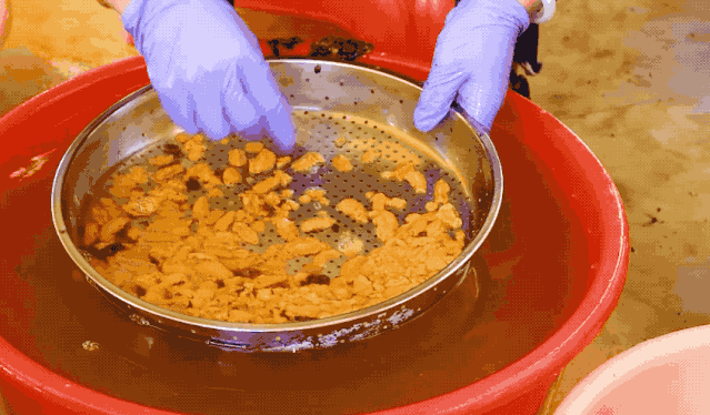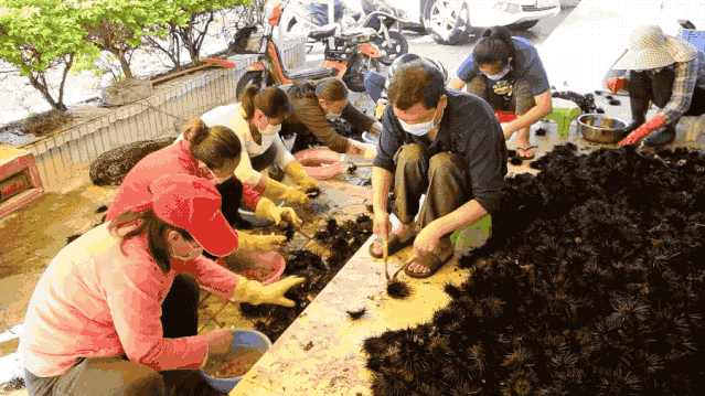 記者來到大鵬新區(qū)南澳海港路的潤成海膽專賣店,看到工人們上下飛舞著鐵鉤“挖海膽”。南澳本地人口中所謂“挖海膽”就是海膽加工,打開海膽殼,把海膽肉取出來,然后用海水清洗干凈。從捕撈到上岸加工處理都必須一天之內(nèi)完成,只有嚴(yán)守時間的把控,爭分奪秒才配擁有鮮美和誘人的口感。