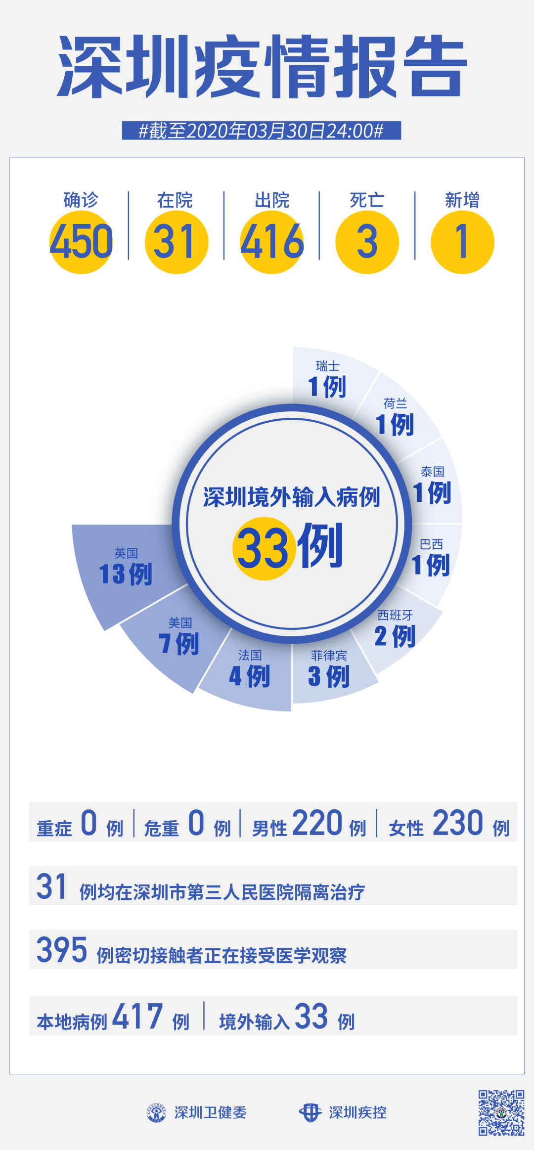 截至3月30日24時,深圳累計報告“新冠肺炎”病例450例。3月30日當天新增1例。