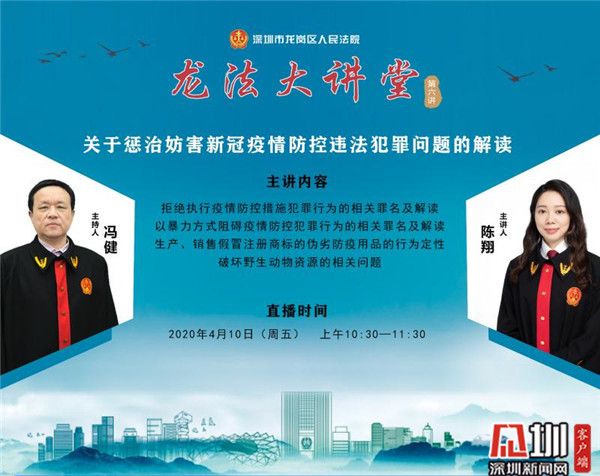 見(jiàn)圳客戶(hù)端·深圳新聞網(wǎng)4月10日訊(見(jiàn)圳客戶(hù)端、深圳新聞網(wǎng)記者 李云云 通訊員 張建國(guó))4月10日上午,龍崗法院“龍法大講堂”上線第六講,再次以直播方式,就妨害疫情防控違法犯罪問(wèn)題向觀眾進(jìn)行詳細(xì)解讀。