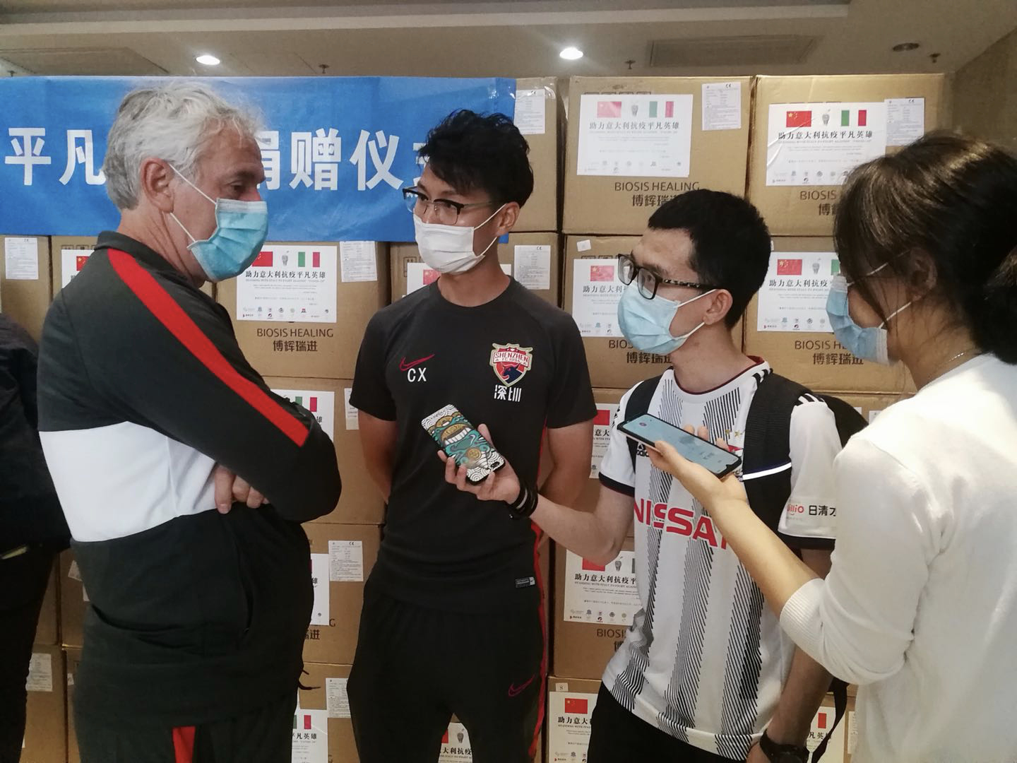 “感謝深圳?!碑斕?,AC米蘭俱樂部前教練、深圳佳兆業(yè)足球隊主教練多納多尼作為在深意大利人代表也來到了活動現(xiàn)場。他表示,來深圳不到一年,已經(jīng)深刻感受到深圳的城市魅力?!爸袊谶@次抗擊疫情的過程中表現(xiàn)完美,每個人的一舉一動不僅是為自己,更是為別人,這非常令我感動。此次捐贈對于意大利來說十分重要,我代表我的祖國向大家表示由衷的感謝?!倍嗉{多尼在現(xiàn)場動情地說。(記者 許舜鈿)