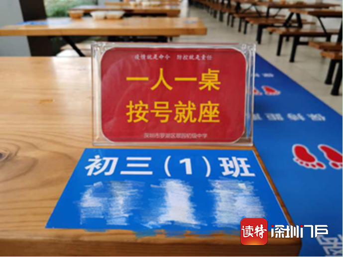 午餐期間,翠園初級中學在食堂的每張桌上貼有學生班級和姓名,一桌一人。就餐期間,學生有序就座。