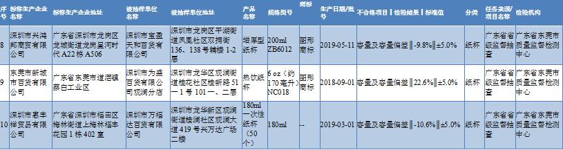 通告顯示,深圳抽檢的3批不合格樣品分別為深圳市寶盈天和百貨有限公司銷(xiāo)售的增厚型紙杯、為盛百貨有限公司觀瀾分店銷(xiāo)售的熱飲紙杯和萬(wàn)福達(dá)百貨有限公司銷(xiāo)售的180ml一次性紙杯(50個(gè)),不合格項(xiàng)目均為容量及容量偏差不符合食品相關(guān)產(chǎn)品安全國(guó)家標(biāo)準(zhǔn)規(guī)定。