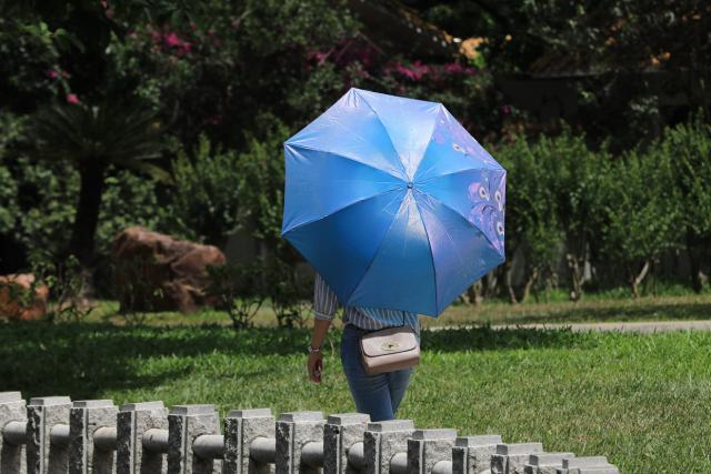 ▲遮陽傘、太陽帽成了市民出行必備之物。