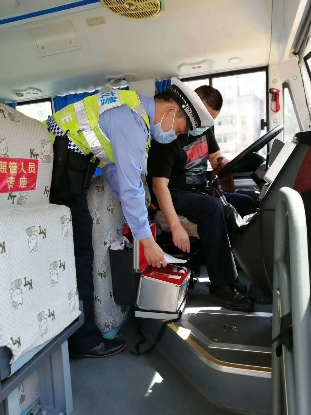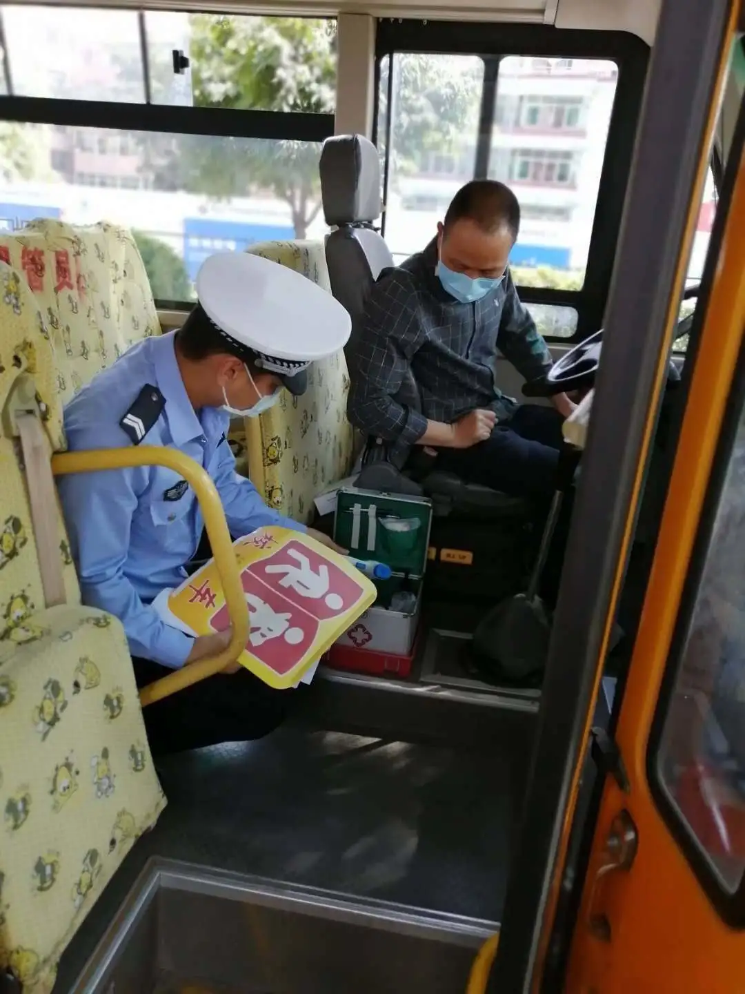 檢查校車車況及安全裝置,是否落實“每個座位一條安全帶”、配備行駛記錄功能的衛(wèi)星定位裝置、干粉滅火器、急救箱和照管人員座椅(位)、應急出口和應急錘(逃生錘)等安全設備、噴涂放大牌號和統(tǒng)一顏色、粘貼標識等。