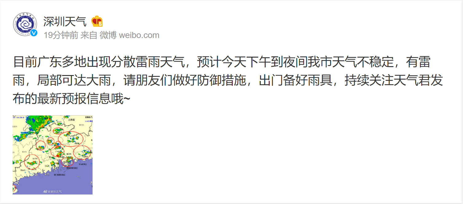 據(jù)@深圳天氣消息,目前廣東多地出現(xiàn)分散雷雨天氣,預(yù)計(jì)今天下午到夜間深圳天氣不穩(wěn)定,有雷雨,局部可達(dá)大雨,請(qǐng)大家做好防御措施,出門(mén)備好雨具,持續(xù)關(guān)注深圳天氣發(fā)布的最新預(yù)報(bào)信息。