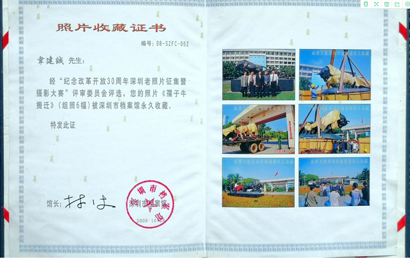 “一開(kāi)始,我提出這個(gè)遷移建議時(shí),還是有點(diǎn)忐忑的,后來(lái)得知‘孺子牛’雕塑將移至市委大院外后,我非常高興,這樣一來(lái),跟‘孺子牛’合影就方便多了呀!”“孺子牛”雕塑遷移當(dāng)天,韋建誠(chéng)興奮地拿起相機(jī),用鏡頭定格下整個(gè)搬遷過(guò)程?!澳且惶焓俏胰松铍y忘的日子之一,既是我44歲生日,又是‘孺子?!袼馨残录抑??!被貞浧甬?dāng)時(shí)的情況,韋建誠(chéng)還是十分興奮。而韋建誠(chéng)拍攝的組照后來(lái)被深圳市檔案館永久收藏。深圳市委辦公廳還將《市民希望將“孺子牛”雕塑移至市府大院外》評(píng)為一等獎(jiǎng)。