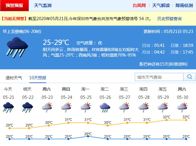 市氣象局預(yù)計(jì),21日凌晨到22日早晨深圳市有暴雨局部大暴雨,并伴有雷暴和8級左右短時(shí)大風(fēng),強(qiáng)降水主要影響時(shí)段在21日午后至22日早晨;22日白天降水減弱,23日轉(zhuǎn)(雷)陣雨天氣。
