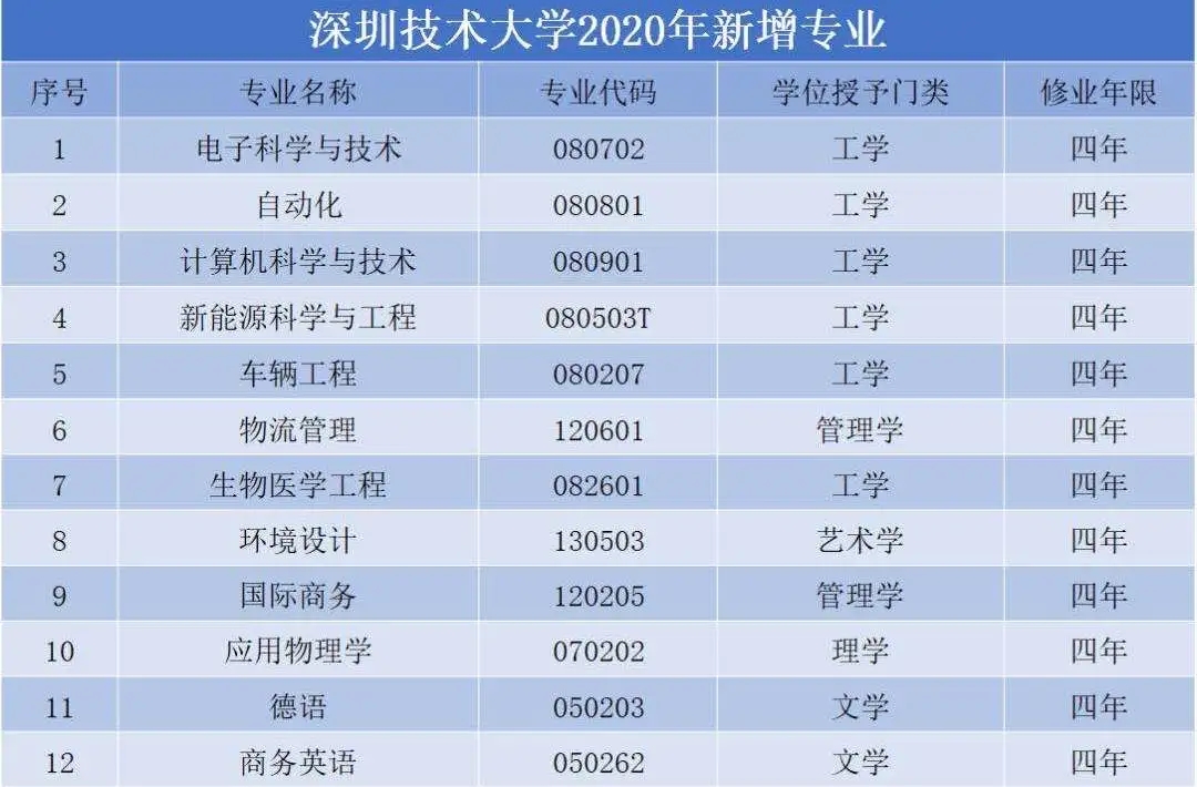 據(jù)教育部2019年本科專業(yè)備案和審批結(jié)果,在2019年機械設(shè)計制造及其自動化、物聯(lián)網(wǎng)工程、光源與照明、交通運輸、汽車服務(wù)工程、工業(yè)設(shè)計等6個專業(yè)的基礎(chǔ)上,2020年,深圳技術(shù)大學將新增12個專業(yè),屆時招生專業(yè)將達18個。