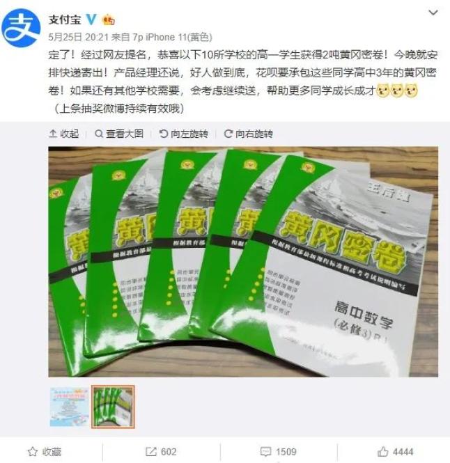 最近有些高中收到了支付寶贈送的2噸黃岡密卷。