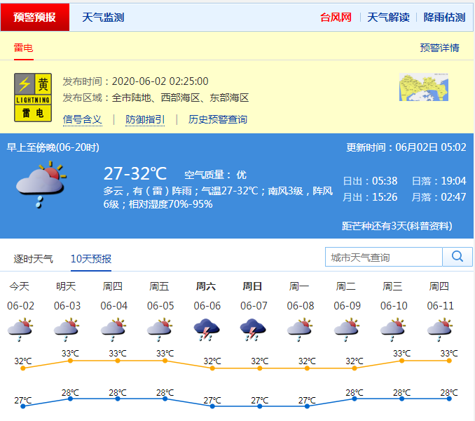 市氣象臺預(yù)測,3-4日有短時(shí)陣雨或雷陣雨,天氣悶熱。5-7日有陣雨或雷陣雨,部分時(shí)間雨勢較大。近期西南季風(fēng)活躍,降雨局地性明顯,降雨較急,注意防范局地雷雨及其引發(fā)的水浸、地質(zhì)災(zāi)害等次生災(zāi)害。