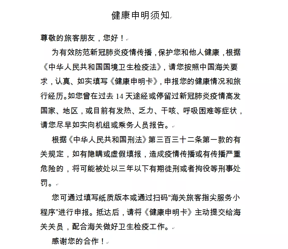 一、請?zhí)崆跋螺d打印《健康申明卡》(見附件1),或關(guān)注“海關(guān)旅客指尖服務(wù)小程序”(見附件2)。提前如實填寫紙質(zhì)或電子健康申報信息,通關(guān)時主動向海關(guān)申報。