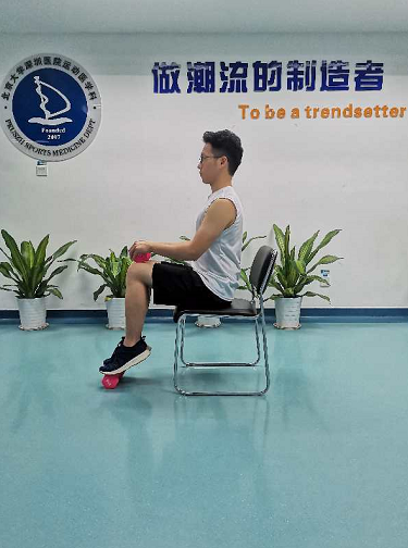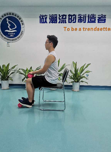 坐姿提踵,坐在椅子上,大腿平行于地面,小腿垂直于大腿,前腳掌置于有一定高度的墊片上,雙手持一合適的重物于膝蓋上;小腿發(fā)力慢抬至最高點保持3秒鐘后慢放至最低點保持3秒鐘,此動作重復(fù)30次-50/次×3-5組。