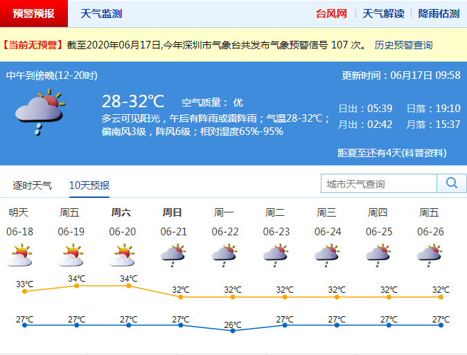 6月17日,深圳多云可見陽(yáng)光,午后有陣雨或雷陣雨;氣溫28-32℃;偏南風(fēng)3級(jí),陣風(fēng)6級(jí);相對(duì)濕度65%-95%