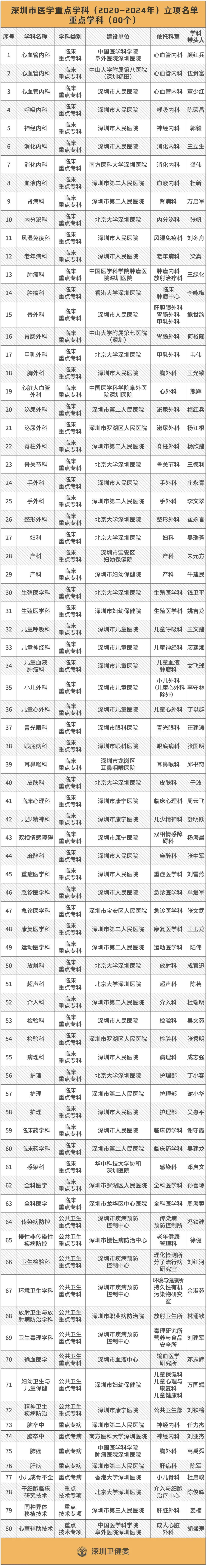 6月19日,深圳市衛(wèi)健委公布了2020-2024年的深圳市醫(yī)學重點學科立項名單,包括80個重點學科、15個重點培育學科。此外,深圳還有24個??迫脒x“省重點”名單,其中13個是國家衛(wèi)健委或國家中醫(yī)藥管理局認定的國家級臨床重點???。這份名單是2019年由廣東省衛(wèi)健委公布的“廣東省高水平臨床重點??啤泵麊?。