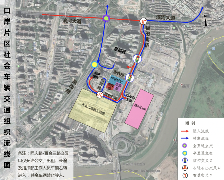 臨時(shí)口岸期間機(jī)動(dòng)車交通按照“流線順暢、客貨分離、人車分離”的原則進(jìn)行組織。主要利用口岸片區(qū)的皇崗路、百合路、福田南路、同慶路等進(jìn)行組織。各交通方式交通組織流線圖如下: