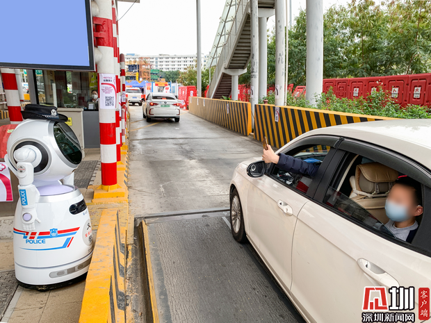 ▲5G機器人義警“黃田田”提醒回深車輛掃碼登記。
